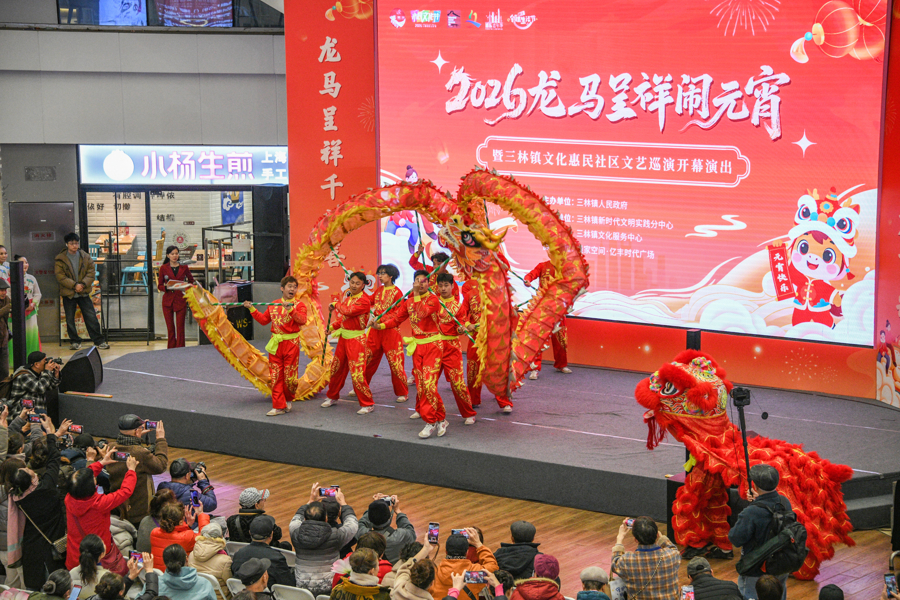 3月2日,浦东新区三林镇亿丰时代广场内龙狮腾跃、锣鼓喧天,一派热闹景象。翻滚腾挪间,金龙盘旋成祥龙献瑞造型,狮嘴吐出对联“春风得意万事兴”“龙马呈祥千门喜”,引得现场叫好声一片。紧随其后,文艺演出、非遗市集、民俗互动等活动渐次登场。