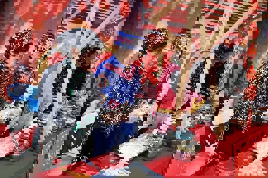 其间,贤姑巧姨们现包现烹汤圆、塌饼,让现场热气升腾。“三林的大汤圆个头比普通汤圆大一圈,用水磨糯米粉制作,三揉三醒,馅料可咸可甜双选。三林塌饼是极具代表性的乡土点心,沪语谐音“太平”,讨太太平平的好彩头。”70岁的俸梅香一边招呼着过往的人品尝刚出锅的塌饼,一边不忘手中的活计。当天,她特意穿上了华美的壮族服饰。“我父亲年轻的时候从广西来到上海,从此在这里扎下了根,我们很喜欢这座城市。”俸梅香说,三林镇每年都会邀请镇里少数民族居民同来过元宵,大家围坐一起包汤圆、做塌饼,很温馨。