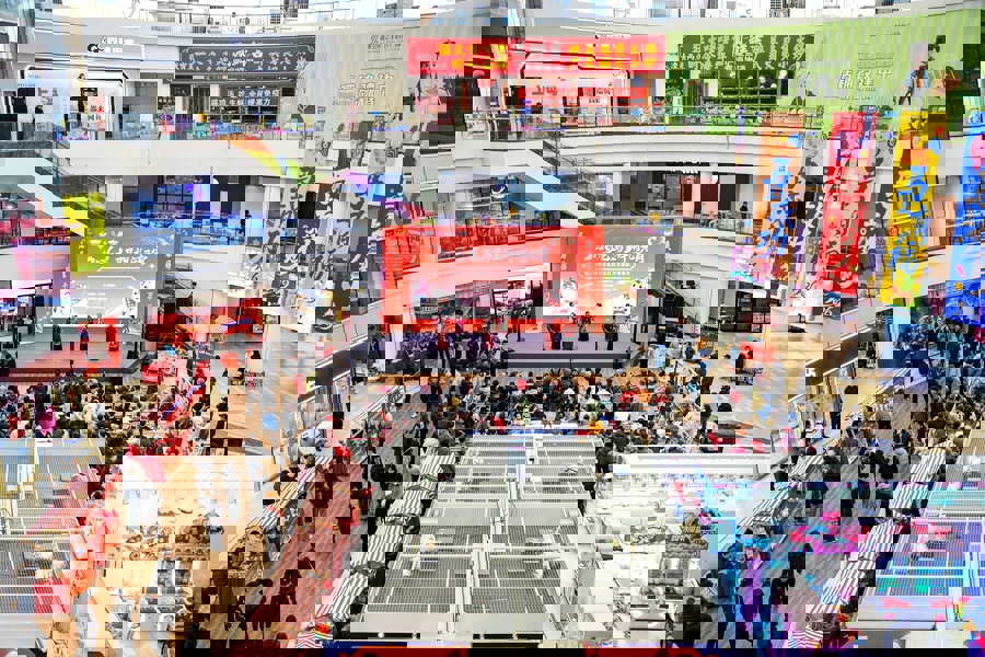 突显“闹”的主题,元宵节的演艺活动自然也少不了。喜庆的民乐江南丝竹演奏《扬鞭催马运粮忙》,拉开了当天演出活动的序幕。沪剧表演唱《看龙舟》、诗朗诵《春江花月夜》、时装秀《江南雨韵》、舞蹈《红红火火闹元宵》等节目轮番登场,吸引众人驻足。“元宵就该热热闹闹地过,我们每年这个时间点都会来‘轧闹猛’!”看到活动预告,住在杨浦区的苏宾和朋友约好,背着相机就来了。“有段时间没和阿哥碰面了,商场里有好几家不错的本帮菜,正好聚聚。”