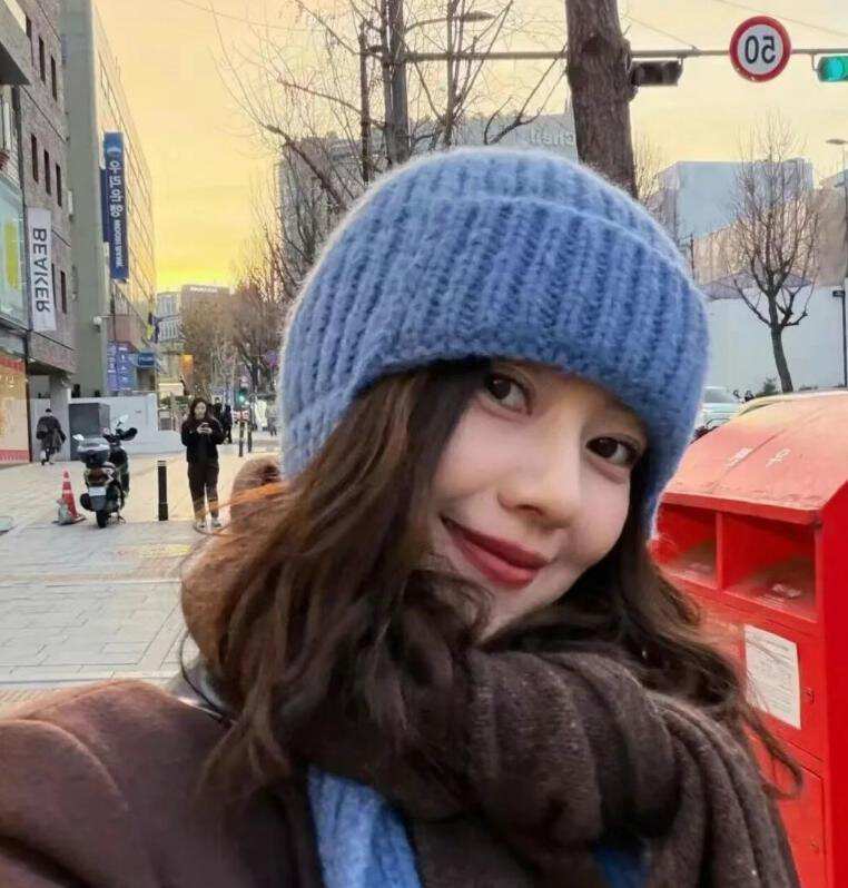 拉近镜头,长卷发,明亮的眼眸。厚实的围巾,栗色大衣,出场的依旧是那顶帽子。