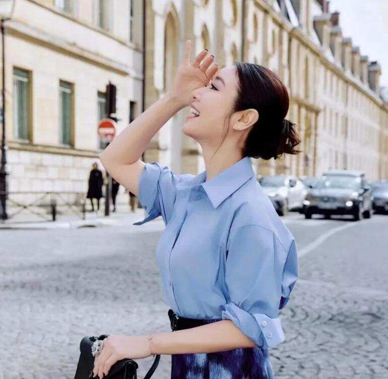 蓝色清爽,晚期的发髻不用再装嫩扎马尾辫,印花蓝的长裙腰带是亮点,高高束在腰间。