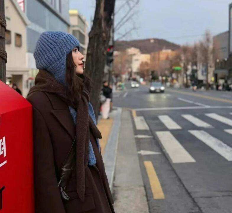 他去拍街景,就换了一身更加青春可人的冬装,也比这身长黑色大衣更加灵动。