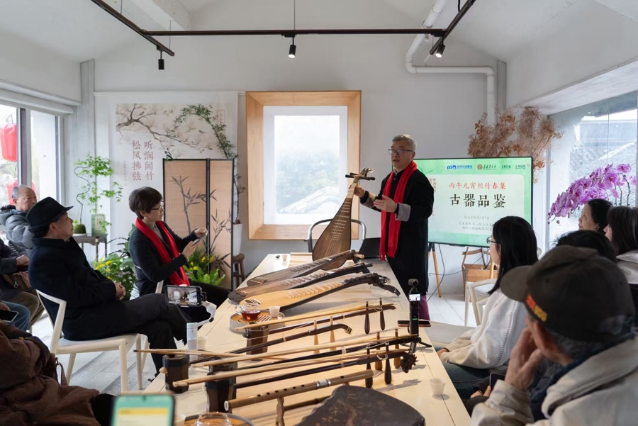 “你们听,丝弦和钢丝弦的音色区别在哪里?”沈正国一边示范,一边引导观众对比不同弦材带来的音色变化。丝弦的声音不那么亮,但余韵绵长,像水墨晕开,与合奏中其他声部能够更柔和地交织。不少曲友围在一起切磋品鉴,共赏共议。