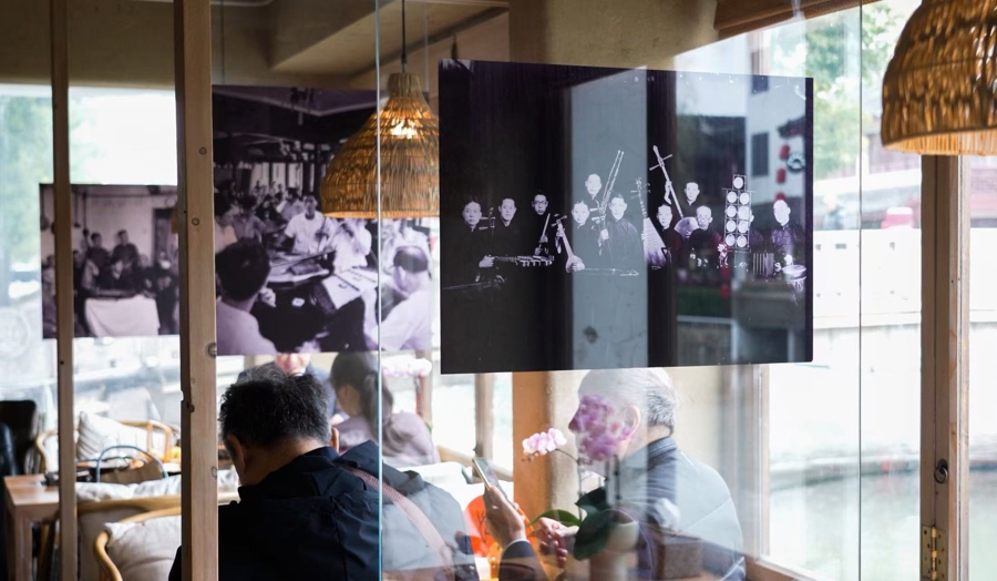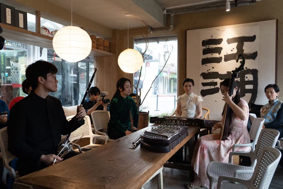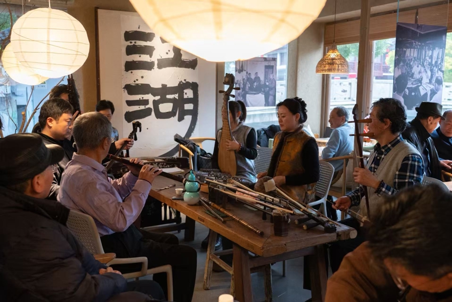 穿过七宝老街的石桥,隐约有丝竹声从一座茶楼里飘出来,与元宵时节的年味缠在一处。赏心院一楼堂内,四五位乐手围坐方桌,二胡、笛箫、琵琶、扬琴次第响起——不是台上一字排开的音乐会,而是老友相聚玩起了音乐。