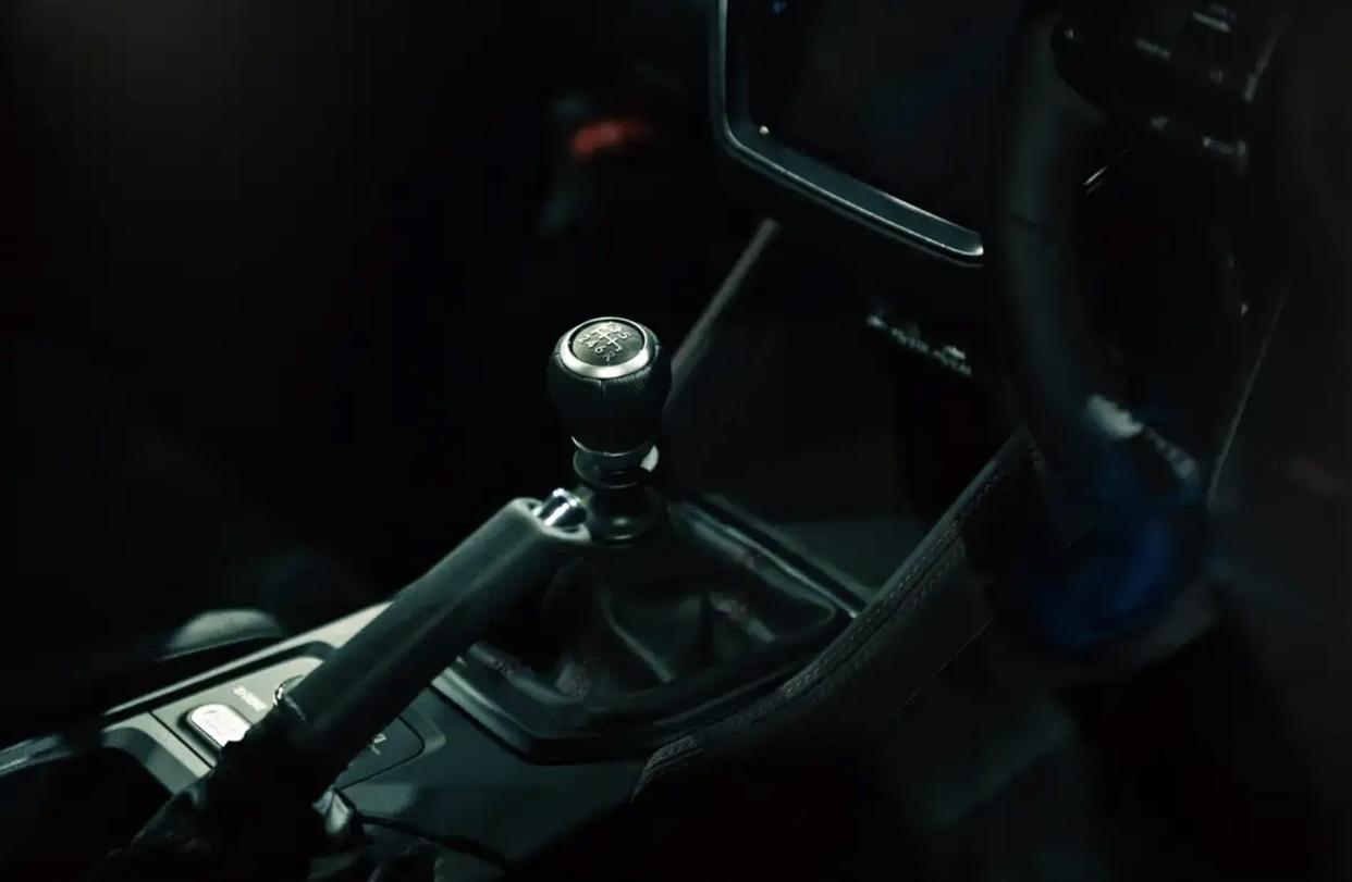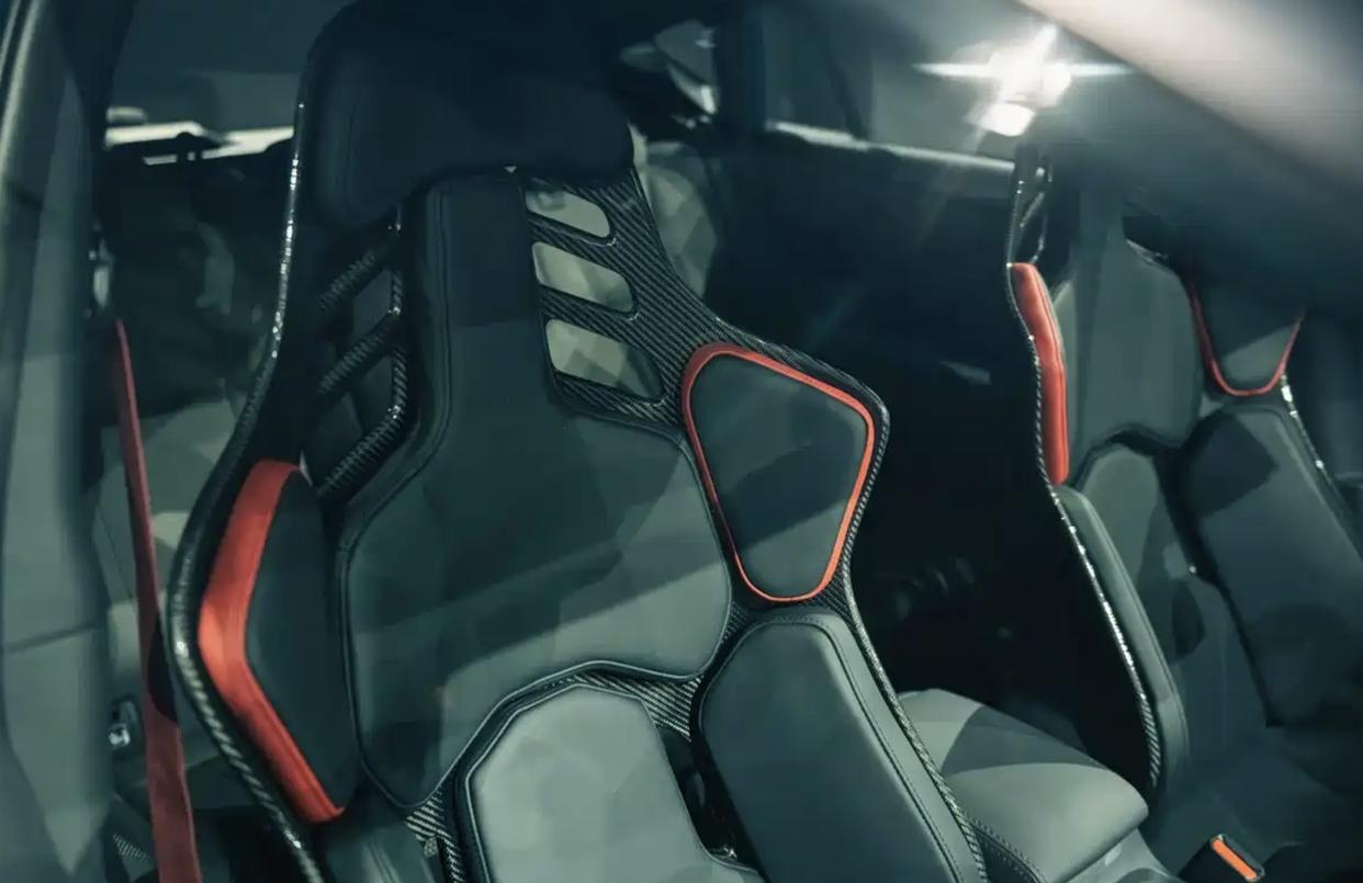 内饰依旧充满着赛车气息,配备更加运动的且轻量化的碳纤维壳体的Recaro桶形座椅,还加入了薄绒材质的铺陈,加快加厚的侧翼加入了红色皮革材质的衬垫,脖颈位置采用了镂空的样式,不仅轻量化,也带来了更好的包裹性和支撑性。中控台依旧采用了大家熟悉的经典的T字形结构,通过不同种材质的运用,带来了丰富的层次感。镂空式三辐方向盘采用了防滑的麂皮绒包裹,红色的一键启动按钮在方向盘右下侧(类似于法拉利的设计),再加上极具复古气息的“光头”手动换挡拨杆和脚底下的三个踏板,提升了整车的运动气息。
